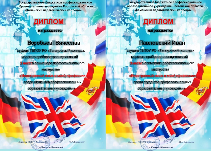 Олимпиада проводилась среди студентов профессиональных образовательных учреждений РФ, в заочной форме. Преподаватели иностранного языка, Дрыгин С.А. и Соха Л.И., подготовившие студентов к участию, получили благодарственные письма.